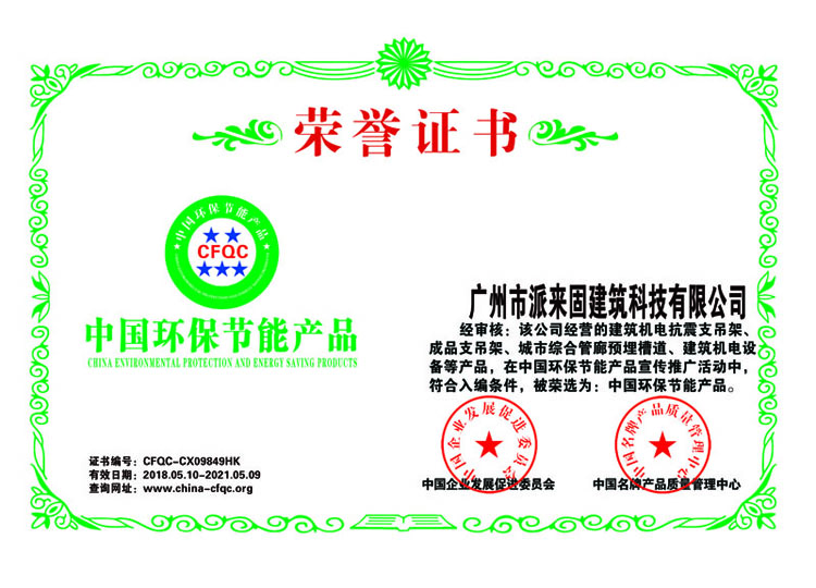 中国环保节能产品荣誉证书